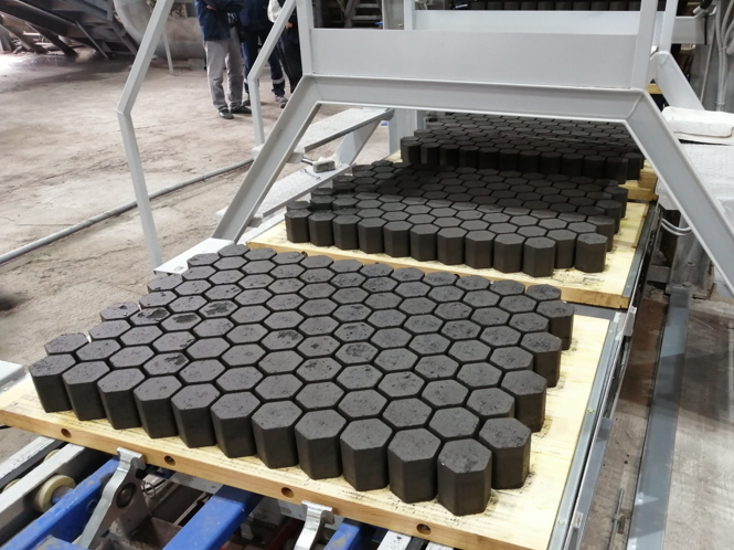 После получения великолепных результатов – печь «задышала», приступили к производству BSR на простейшем вибропрессе «RUKIS», приобретенном для производства тротуарной плитки 200х100х60 мм. Всего было произведено около 50 тыс. таких брикетов.